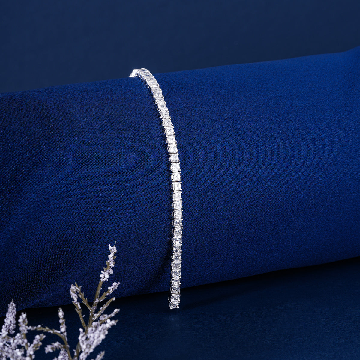 Each diamond in this continuous line is a perfectly calibrated 3.5mm Asscher Cut. With a total weight of 12.528 Carats, this bracelet provides a thick, substantial "ribbon" of ice around your wrist. Expertly handcrafted in Solid 14K Gold, the square step-cut diamonds are secured in a vintage-inspired 4-prong setting that highlights their clean, cropped corners and deep, clear facets.