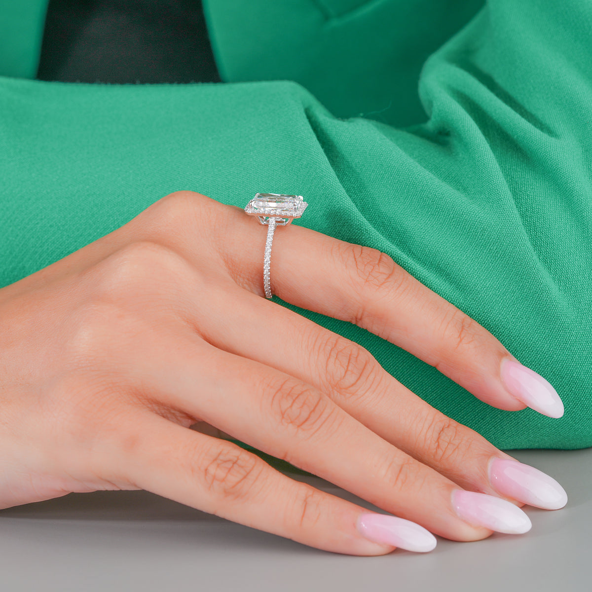A perfect blend of ethical luxury and refined taste, showcasing a breathtaking Radiant center stone in a classic diamond-accented setting.