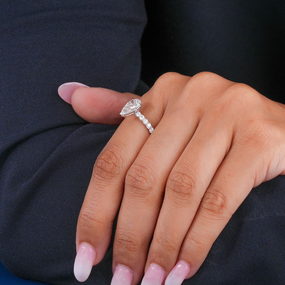 A perfect blend of ethical luxury and refined taste, showcasing a breathtaking Pear center stone in a classic diamond-accented setting.