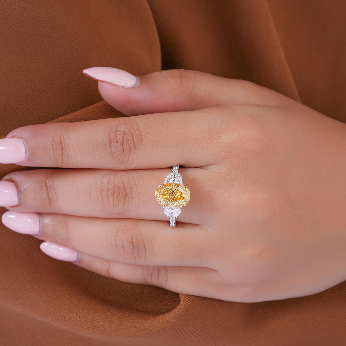3.20 CT Yellow Oval Cut Pave, side Half moon Two-Stone Engagement Ring