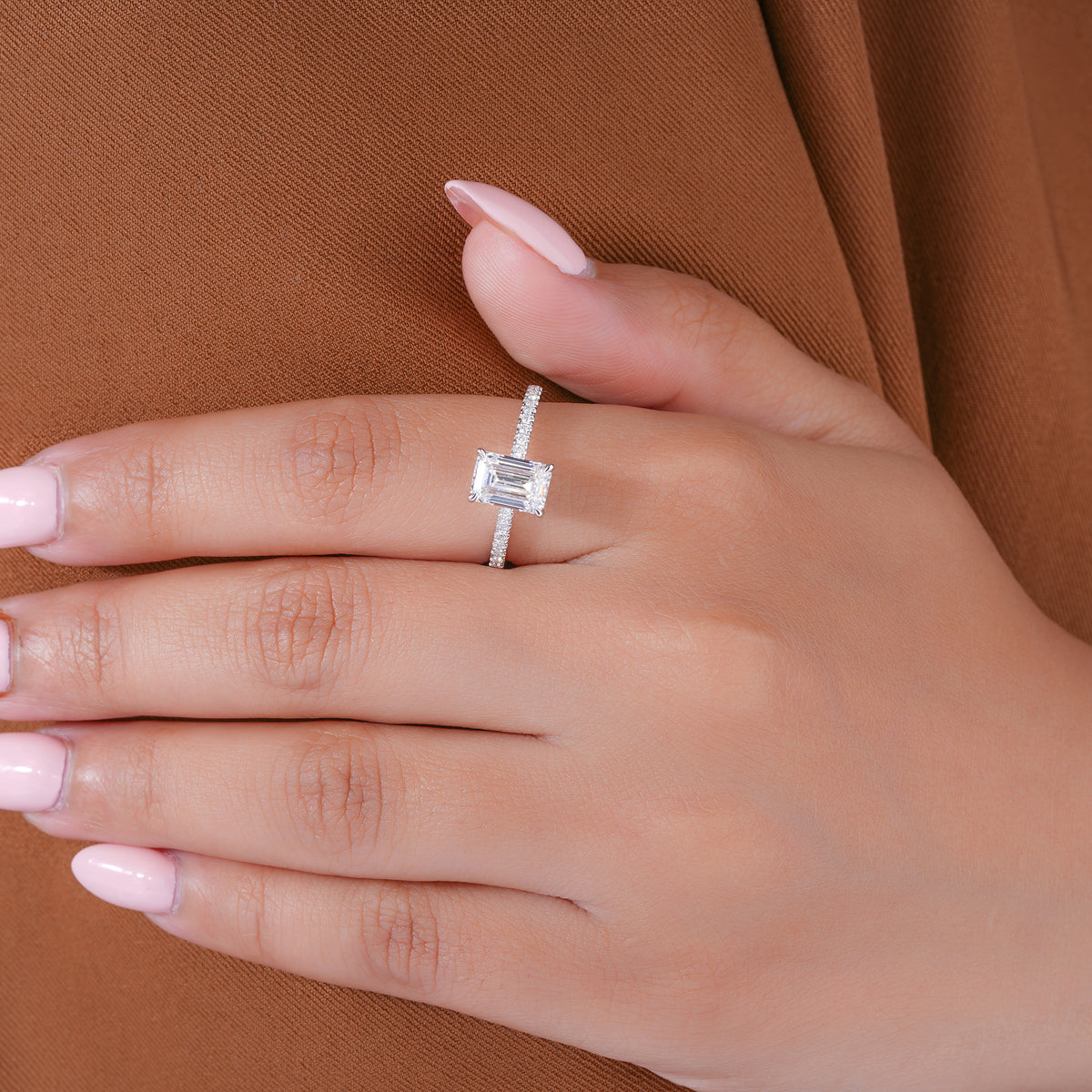 A perfect blend of ethical luxury and refined taste, showcasing a breathtaking Emerald center stone in a classic diamond-accented setting.