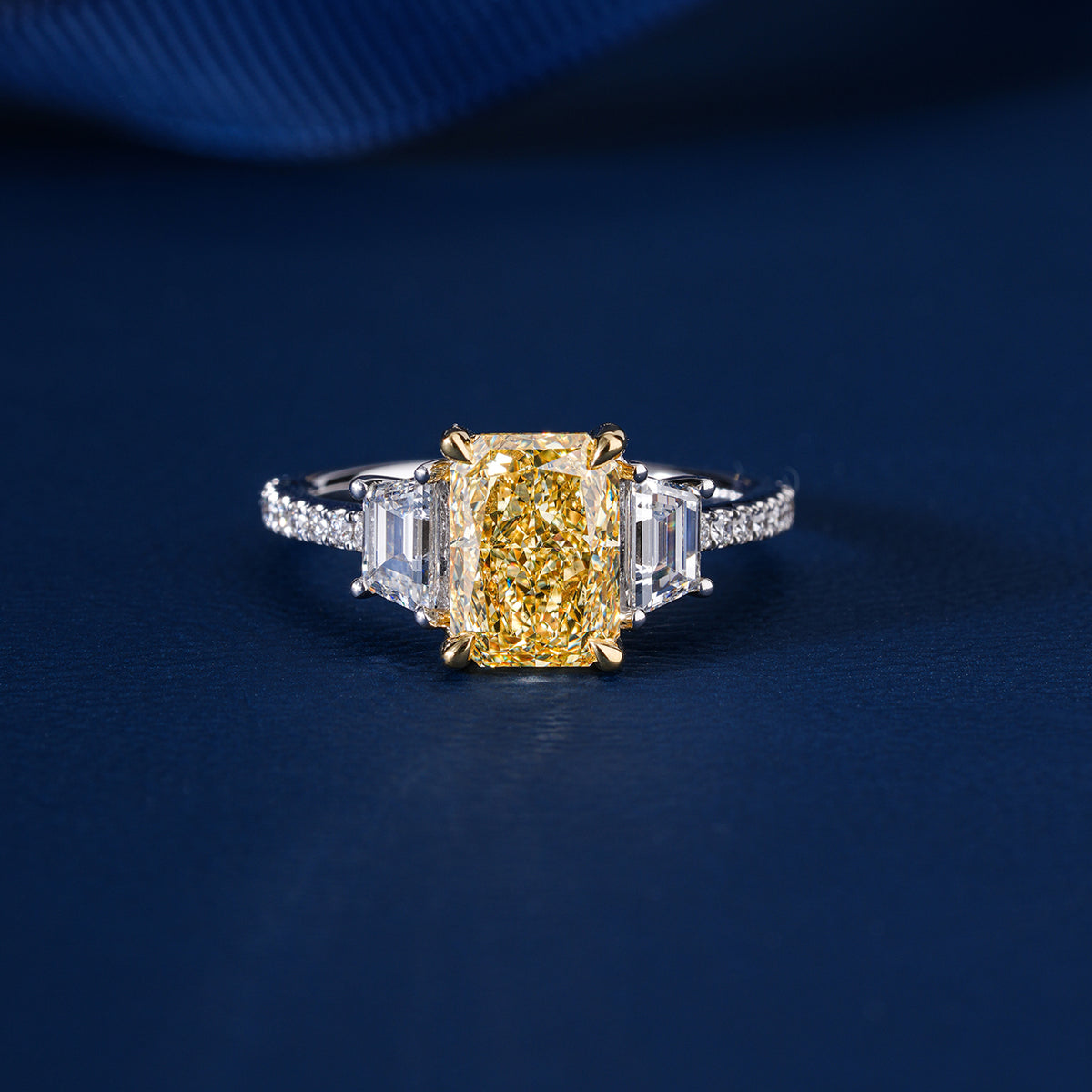 A perfect blend of ethical luxury and refined taste, showcasing a breathtaking Radiant center stone in a classic diamond-accented setting.
